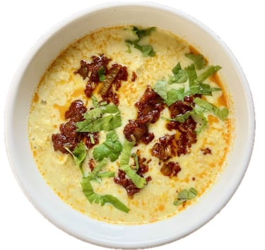 A L'ŒIL :Il a une base chaude, d’un jaune doré rappelant le jaune d’œuf, surmontée d’un tadka rouge vif et crépitant. Des feuilles de coriandre fraîche parsemées ajoutent une touche de vert éclatante.