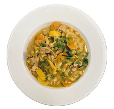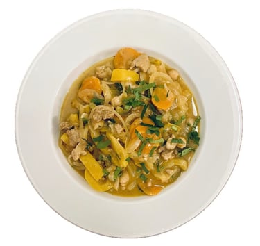 PALATE :It offers a velvety and creamy texture: the tender pieces of chicken and tofu absorb the flavors, creating a delicate and comforting harmony.