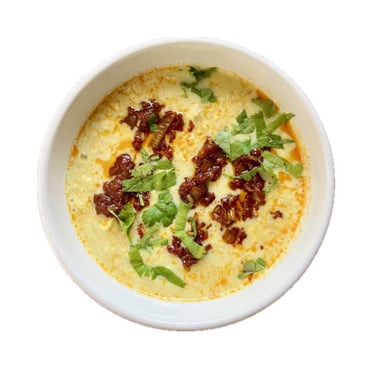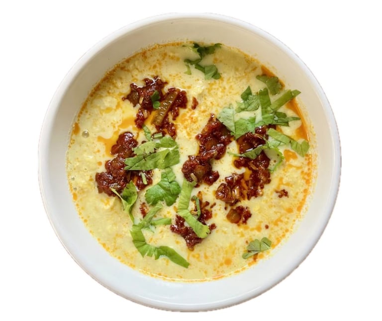把大豆混合物倒入锅中,加入姜黄粉和盐,煮沸后转小火,煨炖约 20 分钟;