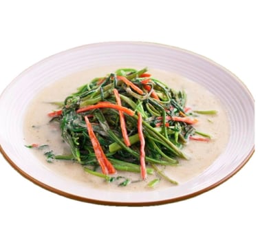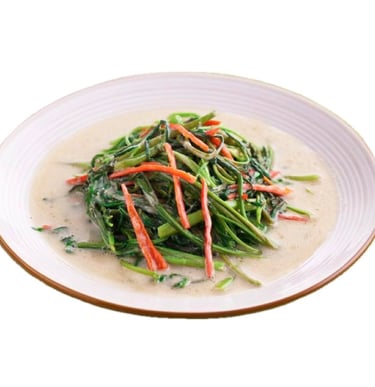 入口 :食谱中加入微量糖的目的是为了调和腐乳粗犷的个性,以凸显鲜味,使成品味道更圆润,但菜品本身是没有甜味的。浆化后的腐乳使得菜汁质地微带粘稠,有肉汁的挂壁效果,而通菜正是蔬菜中的通心粉,中空的内心是吸汁神器,可谓口口汁浓顺滑。